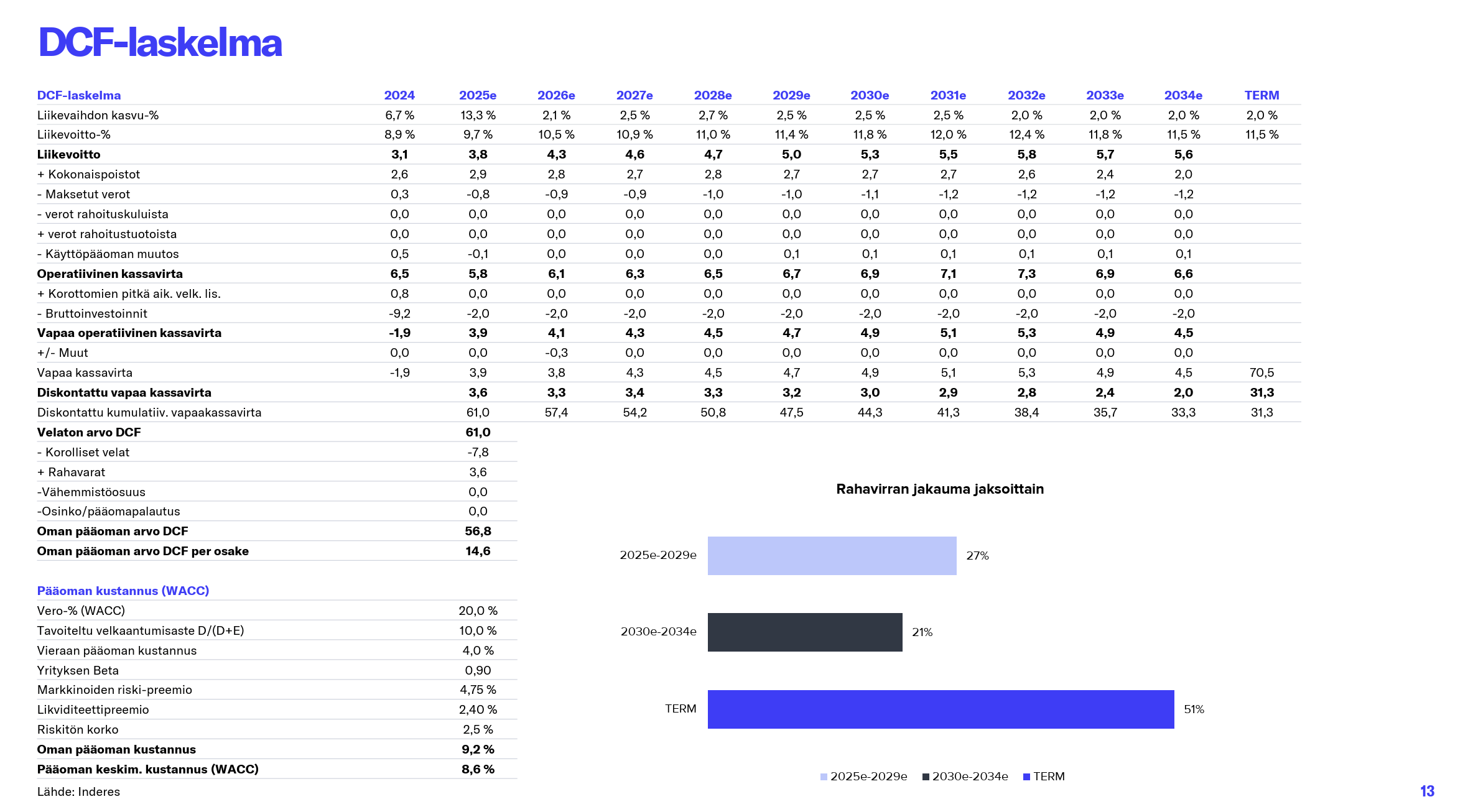 Aallons cashflow-model giver aktien en værdi på knap 15 euro med antagelser, der i hvert fald ikke kan karakteriseres som aggressive. I praksis vil den 2-2,5 % salgsvækst sandsynligvis komme fra prisstigninger og er i tråd med Finlands nominelle økonomiske vækst. Eller vi kan antage, at Finlands økonomi ville vokse reelt med 0 % og inflationen ville være 2 %, og det ville være okay.
