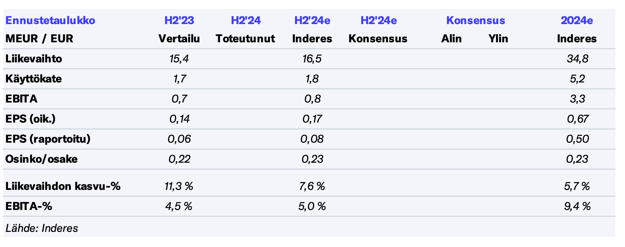 For en gangs skyld tvivlede en “tuulari” (amatørinvestor) med rette på analytikerens moderate rentabilitetsforventninger. Det er fantastisk, at rentabiliteten nu er vendt tilbage til bedre niveauer også i denne roligere halvdel af året. Forhåbentlig forbliver rentabiliteten nu på disse lidt bedre niveauer og udvikler sig endda lidt bedre i de kommende halvår. Måske var sidste års andet halvår blot en enkelt svagere periode. Vækst er nu pænt købt ind til næste år.