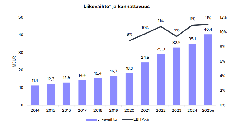 Inderesin raportissa on historiassa tehdyt yrityostot taulukossa. Tuosta voi karkeasti laskea, että 2019-2025 on ostetty n. 24 milj. € liikevaihtoa. Uusimmat ostot näkyvät kokonaan vasta 2026 tilikauden liikevaihdossa, jolle Inderes ennustaa 42,3 milj. € liikevaihtoa. Jos tätä vertaa esim. 2018 tilikauden liikevaihtoon 15,4 milj. €, on kasvu tullut käytännössä kokonaan yritysostoista ja orgaanisesti olisi kasvettu vain vähän.