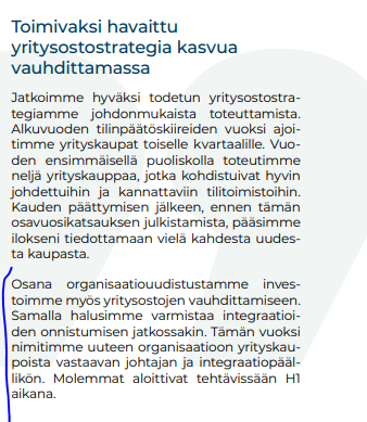 Uuden toimitusjohtajan myötä Aallon Groupiin on rakennettu oma yrityskaupoista vastaava tiimi, joka näitä diilejä hieroo, vie maaliin ja integroi. Tähän ei ole käsittääkseni uusia rekryjä tehty, vaan sisäisiä roolimuutoksia. Näistä oli mainintaa myös H1-raportissa: