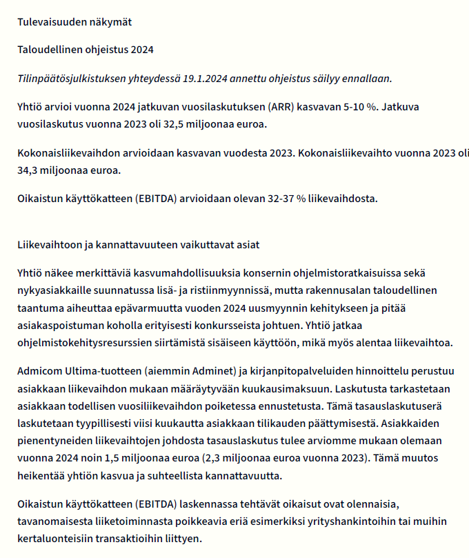 Yhteenvetona kolmas vuosineljännes oli Admicomille vakaan kehityksen aikaa, johon sisältyi hyvä suoritus pienemmässä asiakassegmentissä, tärkeitä muutoksia hinnoitteluun ja tuotestrategiaan sekä ensimmäinen käänne positiivisempaan markkinatunnelmaan rakennusteollisuudessa. Admicomin tekoälyvision julkistaminen on innostava virstanpylväs tuotekehityksellemme, ja Admicommunity-kulttuurimme jatkuva kehittäminen vahvistaa perustaamme tulevalle kasvulle. Vuoden 2024 viimeiselle neljännekselle siirryttäessä arvioimme saavuttavamme koko vuoden taloudellisen ohjeistuksemme. Keskitymme edelleen ARR:n kasvattamiseen uusmyynnin, lisä- ja ristiinmyynnin sekä asiakaspoistuman pienentämisen avulla. Olemme vakuuttuneita siitä, että nämä aloitteet yhdistettynä panostuksiin kansainväliseen laajentumiseen luovat pohjan kiihtyvälle kasvulle vuonna 2025.