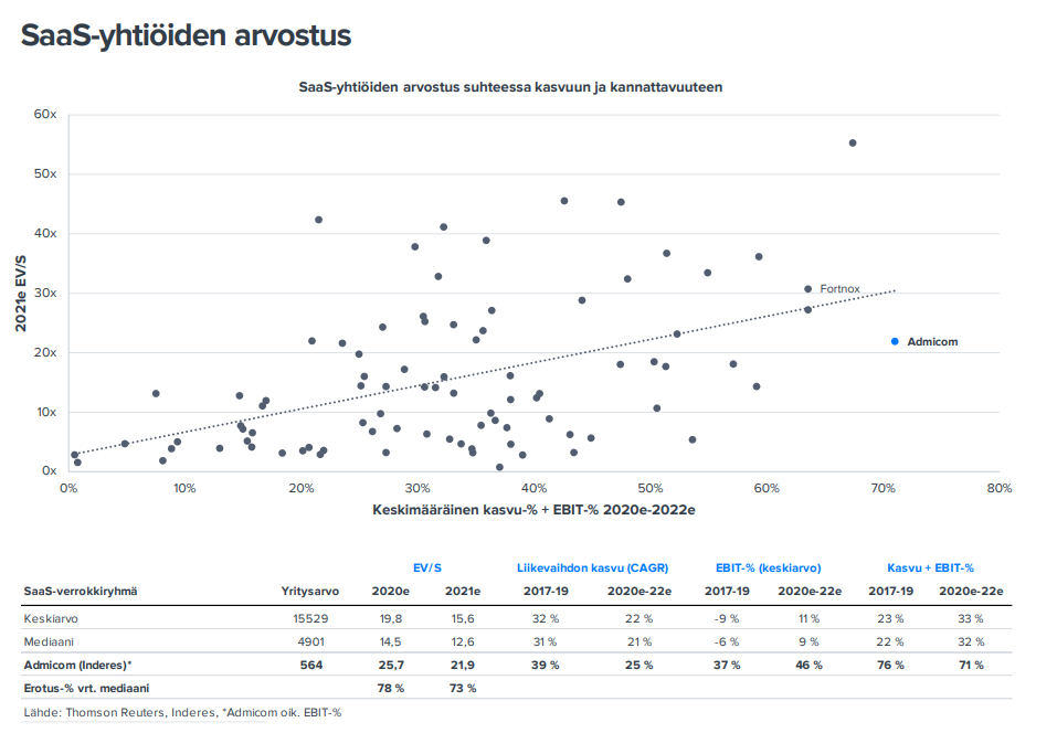 Piti ihan palata tämän viestin innoittaman tuonne vuoden 2020 loppuun ja käydä ihastelemassa sen ajan kuplaisessa ympäristössä tehtyjä ennusteita. Nehän olivat lopulta aivan tappiin viritetyt ja silti arvostuskertoimet poskettoman kovia. Suositus oli sentään vähennä, olisihan se pitänyt olla tietenkin jälkikäteen katsottuna vahva myy Olin siinä vasta joitakin kuukausia ehtinyt Admicomia seurata, ja muistan sen hämmennyksen, kun osake vain raketoi ylöspäin isolla vaihdolla, vaikka arvostus on erittäin korkea. Silloinhan tuohon voimakkaaseen nousuun monet kv-sijoittajat tulivat osakkeeseen mukaan ja blokkikaupat viuhuivat. Se jarrutti haluja ottaa vahvaa näkemystä tuolloin, kun momentum oli niin vahva, ja takaraivossa ajatus “tietävätkö nämä jotain mitä en vain ymmärrä”.