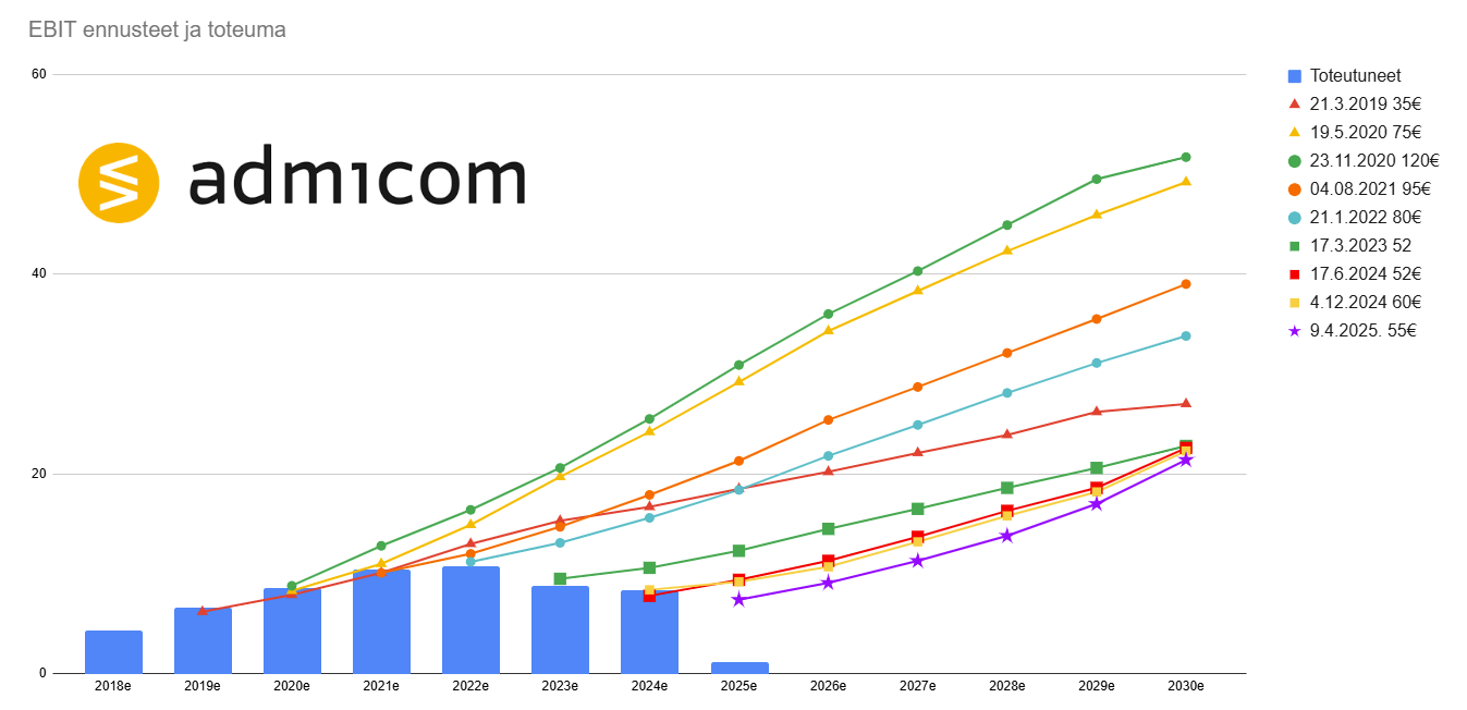 Piti ihan palata tämän viestin innoittaman tuonne vuoden 2020 loppuun ja käydä ihastelemassa sen ajan kuplaisessa ympäristössä tehtyjä ennusteita. Nehän olivat lopulta aivan tappiin viritetyt ja silti arvostuskertoimet poskettoman kovia. Suositus oli sentään vähennä, olisihan se pitänyt olla tietenkin jälkikäteen katsottuna vahva myy Olin siinä vasta joitakin kuukausia ehtinyt Admicomia seurata, ja muistan sen hämmennyksen, kun osake vain raketoi ylöspäin isolla vaihdolla, vaikka arvostus on erittäin korkea. Silloinhan tuohon voimakkaaseen nousuun monet kv-sijoittajat tulivat osakkeeseen mukaan ja blokkikaupat viuhuivat. Se jarrutti haluja ottaa vahvaa näkemystä tuolloin, kun momentum oli niin vahva, ja takaraivossa ajatus “tietävätkö nämä jotain mitä en vain ymmärrä”.