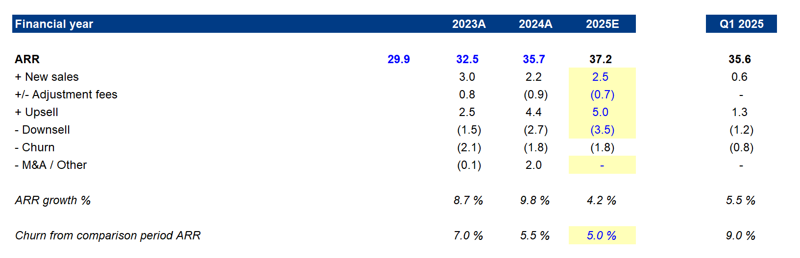 Q1 2025 ARR performanssi oli kuitenkin kohtuullisen heikko ja ohjeistus olettaa merkittävää parannusta YTG vs run-rate Q1.