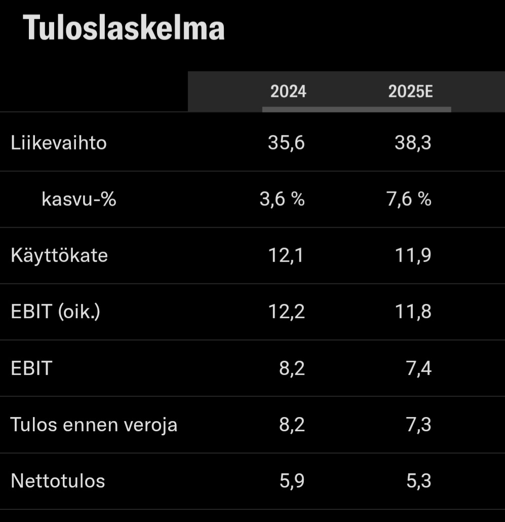 Itse kun nopeasti laskeskelen niin päädyn enemmän +4-6% kasvutasoille vuonna 2025 ilman todella merkittävää parannusta YTG 2025. Alla olevassa kuvassa olevilla oletuksilla +4%.