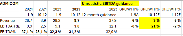 Admicom’s Q3 results and the downgraded 2025 guidance were broadly in line with our expectations. Although the Finnish construction market seems to have bottomed out, the pace of recovery is slow, which leads us to trim 2026E-27E EBITDA by 4%. However, we see Admicom poised for adjusted EBITDA growth from 2026 onwards following three years of declines even without meaningful support from the end market. For 2026, we see scope for organic revenue growth accelerating to 8% (2% for 2025E) on a recently unified product suite and a sharpened go-to market strategy that together allow for a better ability to up/cross-sell, as well as price increases (including Ultima billing model change). With the heaviest growth investments having also been completed over the past years, we expect the adjusted EBITDA margin to expand to 33.7-35.8% for 2026E-27E (32.1% for 2025E). At 17x 2026E EV/EBITDA capex, Admicom trades at a \~30% discount to SmartCraft (23x) despite in line fundamentals. Our multiples-based target price of EUR 56 implies 21x EV/EBITDA capex and 6.7x EV/sales for 2026E. We highlight KKR’s recent acquisition of Swedish Infrobric at a possible valuation of \~9x EV/Sales (2024) as valuation supportive. We upgrade our rating to Buy (Hold).