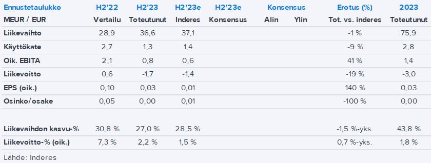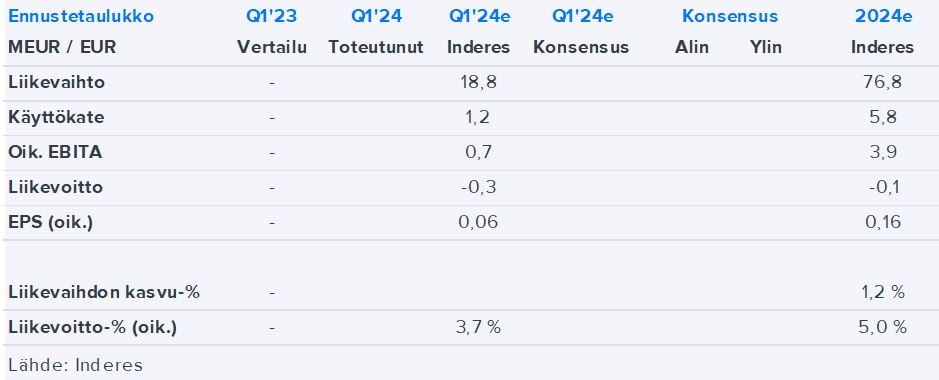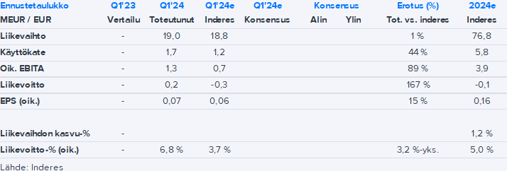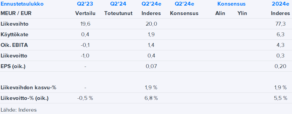 Administer julkaisee Q2-tuloksensa torstaina kello 8.30. Odotamme yhtiöltä pientä liikevaihdon kasvua ja selvää tasokorjausta tulokseen yhtiön kannattavuusohjelman tukemana. Neljänneksille ei ole julkaistu vertailutietoja, mutta olemme purkaneet H1-luvut Q1:n ollessa tiedossa ja tätä kautta esittäneet odotetut Q2-luvut taulukossa. Kausivaihtelun arviointi luo ennustamiseen lisähaastetta ja kasvattaa ennusteriskiä. Odotamme tulosjulkistuksen yhteydessä erityisesti kommentteja eri liiketoimintojen tarkemmasta kehityksestä sekä markkinanäkymistä. Emme ole tehneet ennustemuutoksia, mutta näemme vuoden 2024 ennusteissamme painetta alaspäin. Kasvunäkymän ollessa edelleen heikko tulosparannus nojaa yhä enemmän kannattavuusohjelman etenemiseen.