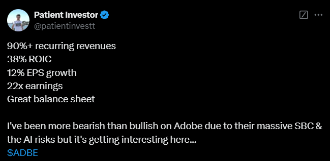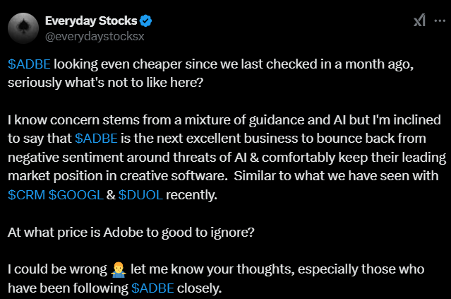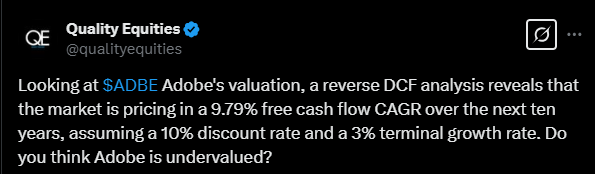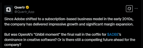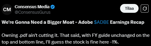 Ei tule kuitenkaan unohtaa, että liikevaihdon kasvu on hidastunut ja sitä, miten kilpailijat myös tarjoavat tekoälyhommia eikä itselläni ole tietoa ainakaan siitä, että Adobe olisi tässä suhteessa ylivertainen. Marginaaleissa ei ole nähtävissä selvää “ylösnousemusta” tulevaisuudessakaan.