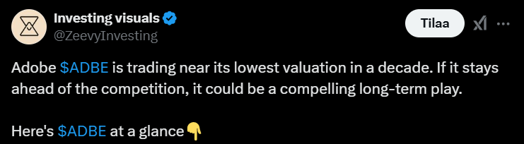 Adoben P/E-luku on nykyään alle viiden vuoden keskiarvon, mikä tarjoaa joistakin houkuttelevan ostomahdollisuuden, vaikka yhtiö kohtaa valuuttakurssien ja markkinasaturaation kaltaisia haasteita. Kokonaisuutena Adobe tarjoaa vakaata, mutta maltillista kasvua korkeakatteisilla ohjelmistomarkkinoilla.
