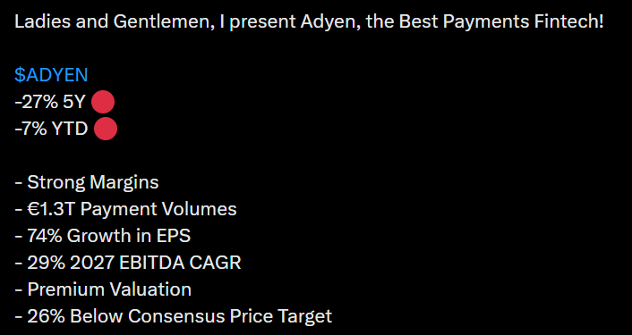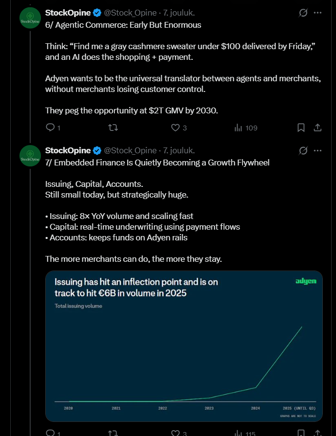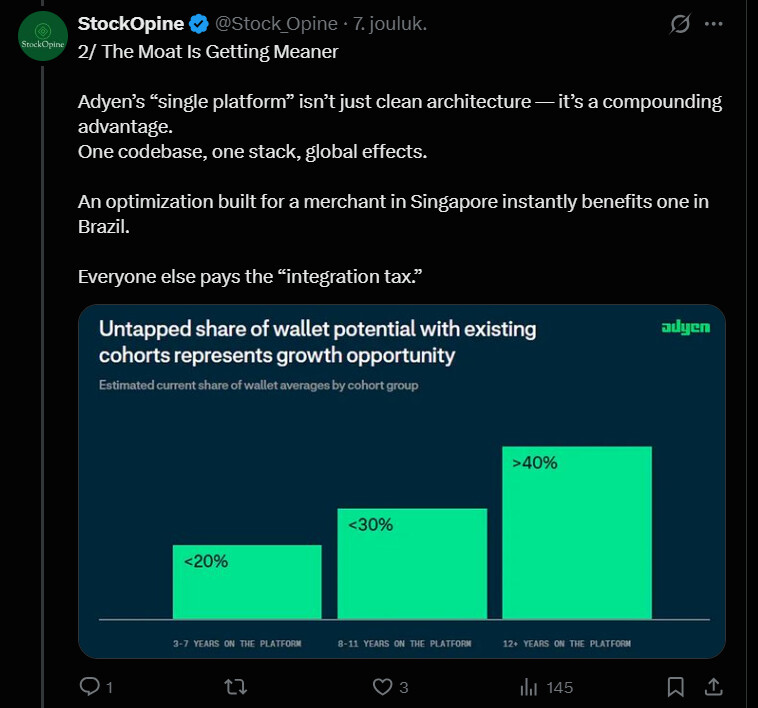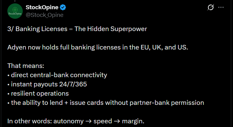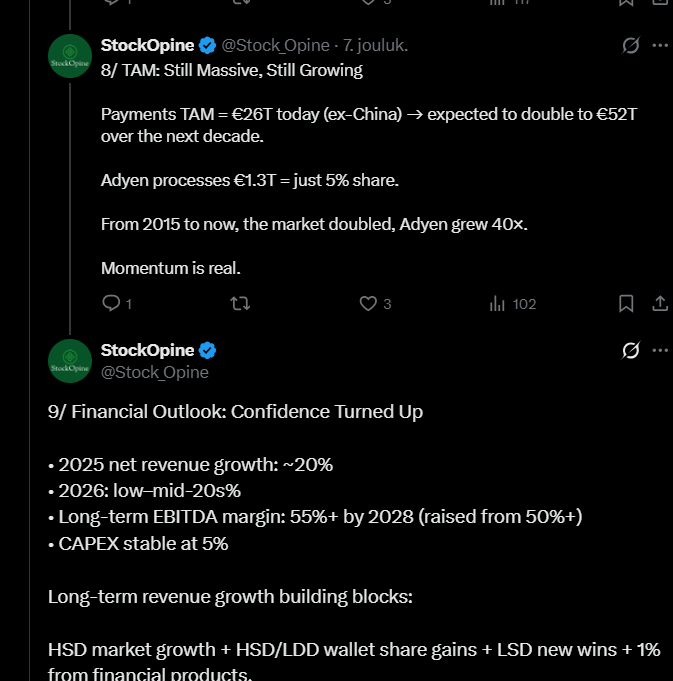 Below is also a tweet thread, where the thread’s creator explains how Adyen’s 2025 Investor Day was a strong demonstration of the company’s confidence. Management further emphasized the competitive advantage brought by the “single platform” model and the importance of banking licenses; for example, a direct connection to central banks brings speed, better margins, and more freedom. The market is reportedly still huge, and Adyen only holds a fraction of it, meaning there’s plenty of potential for growth.