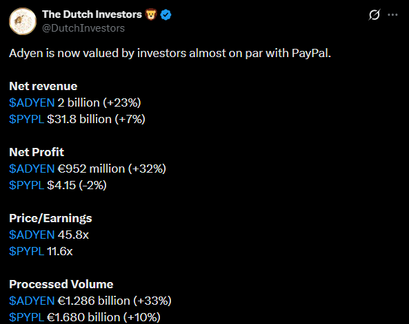 The main point of the tweet is apparently that the market values fast-growing Adyen almost as highly as a traditional boomer company, namely PayPal, even though its revenue is smaller. Adyen’s earnings and processed payments are growing rapidly, while PayPal’s development is more moderate. The company’s high valuation relative to earnings indicates strong belief in Adyen’s future success.