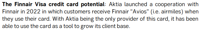 Aktian visio on olla varainhoitopankki, mikä mielestämme on ansiokasta, sillä sen pitäisi ohjata pankkia kohti houkuttelevampia asiakkaita ja pääomakevyitä liiketoimintoja. Pankin perinteisempi osa keskittyy pääasiassa asuntolainaukseen, alueeseen, jonka uskomme näkevän kasvun elpyvän korkojen laskiessa. Finnair Visa -korttiyhteistyö tarjoaa mielestämme houkuttelevan kasvupotentiaalin. Kuten muillakin pankeilla, korkokatteet laskevat ajan myötä korkojen laskiessa, ja suhteellisen suuri palkkiotuottojen osuus muuttuu yhä houkuttelevammaksi.