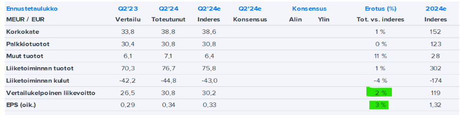Luottotappiot jäivät kvartaalilla odotuksiamme matalammiksi 1,8 MEUR:oon (0,08 % luottokannasta annualisoituna). Luottokannan laadussa nähtiin kuitenkin maltillista heikentymistä järjestämättömien luottojen kasvuna. Tämä voi edelleen ennakoida hieman kasvavia luottotappiomääriä loppuvuodelle. Pankin vakavaraisuudessa ei nähty olennaisia muutoksia.
