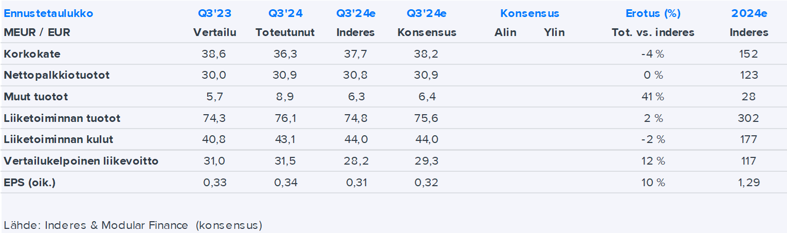 Aktia julkaisi aamulla selvästi odotuksiamme vahvemman Q3-tuloksen. Kehitys oli parempaa sekä tuotto- että kulupuolella, minkä lisäksi luottotappiot jäivät maltillisiksi. Pelkkää juhlan aihetta raportti ei kuitenkaan tarjoillut, sillä pankin tuottojen kannalta keskeinen korkokate laski odotuksiamme voimakkaammin. Aktia ei odotetusti koskenut kuluvan vuoden ohjeistukseensa, jonka mukaan pankki odottaa sen vertailukelpoisen liikevoiton olevan korkeampi kuin edellisvuonna (2023: 104,8).