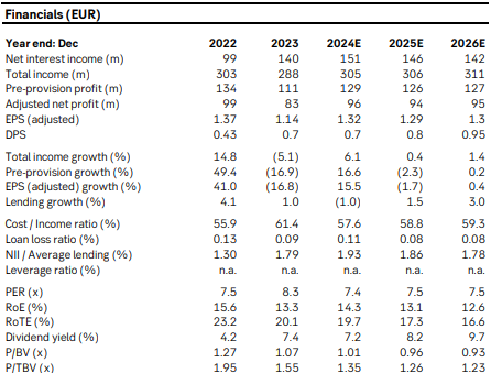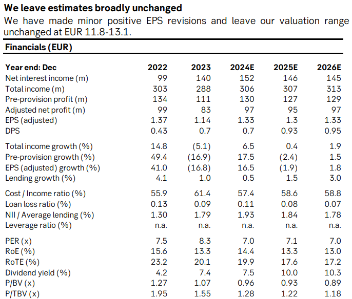 We cut our NII forecasts by 1% on system volume growth continuing to be weak, and EPS falls by 1% for 2025E and 2% for 2026E. At 7.5x 2025E EPS, Aktia’s multiple is lower than its peers. We reduce our fair value range to EUR 11.5-13.0 (11.8-13.1) on slightly lower estimates. Our EUR 0.8 dividend expectation is based on a 61% payout ratio and leaves the CET1 ratio at 12.0%, which gives Aktia a management buffer above its CET1 requirement of 340bp (should decline over time, we believe).