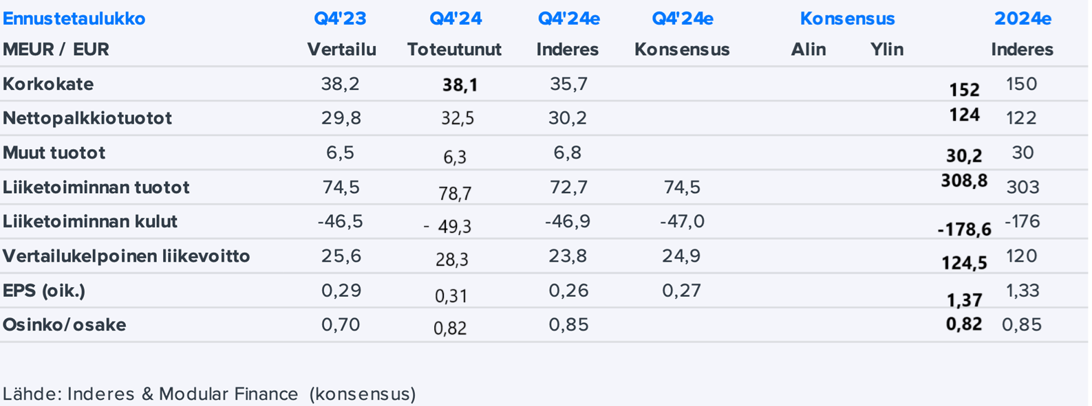 Osinko kuitenkin arvioidaan nousevan; 0,7 eur 2024 (kuten 2023), 0,8 eur 2025 ja 0,95 eur 2026.