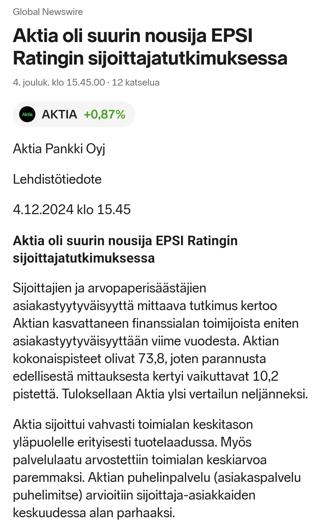 Aloittaessani tehtävässäni totesin Aktiassa olevan paljon potentiaalia. Tämä ajatus on ohjannut työtämme, kun olemme tarkastelleet strategiaamme varmistaaksemme arvoa luovan matkan kohti tavoitettamme olla ainutlaatuinen, johtava varainhoitaja, jolla on vahvat pankkiliiketoiminnan juuret. Järjestämme 27.2.2025 sijoittajatapahtuman, jossa esittelemme tarkennetut strategiset suunnitelmamme ja päivitetyt taloudelliset tavoitteemme.