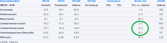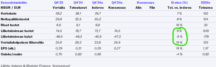 Q4/2023 oli tosiaan lievä pettymys, mutta muuten tuotot ovat jatkuvasti ylittäneet ennusteet, kulut alittaneet ennusteet, ja liikevoitto ylittänyt ennusteet (yleensä double-digit ylitys). Markkinat ovat kuitenkin sitkeästi sitä mieltä että pienikin nousu olisi kohtuuton.