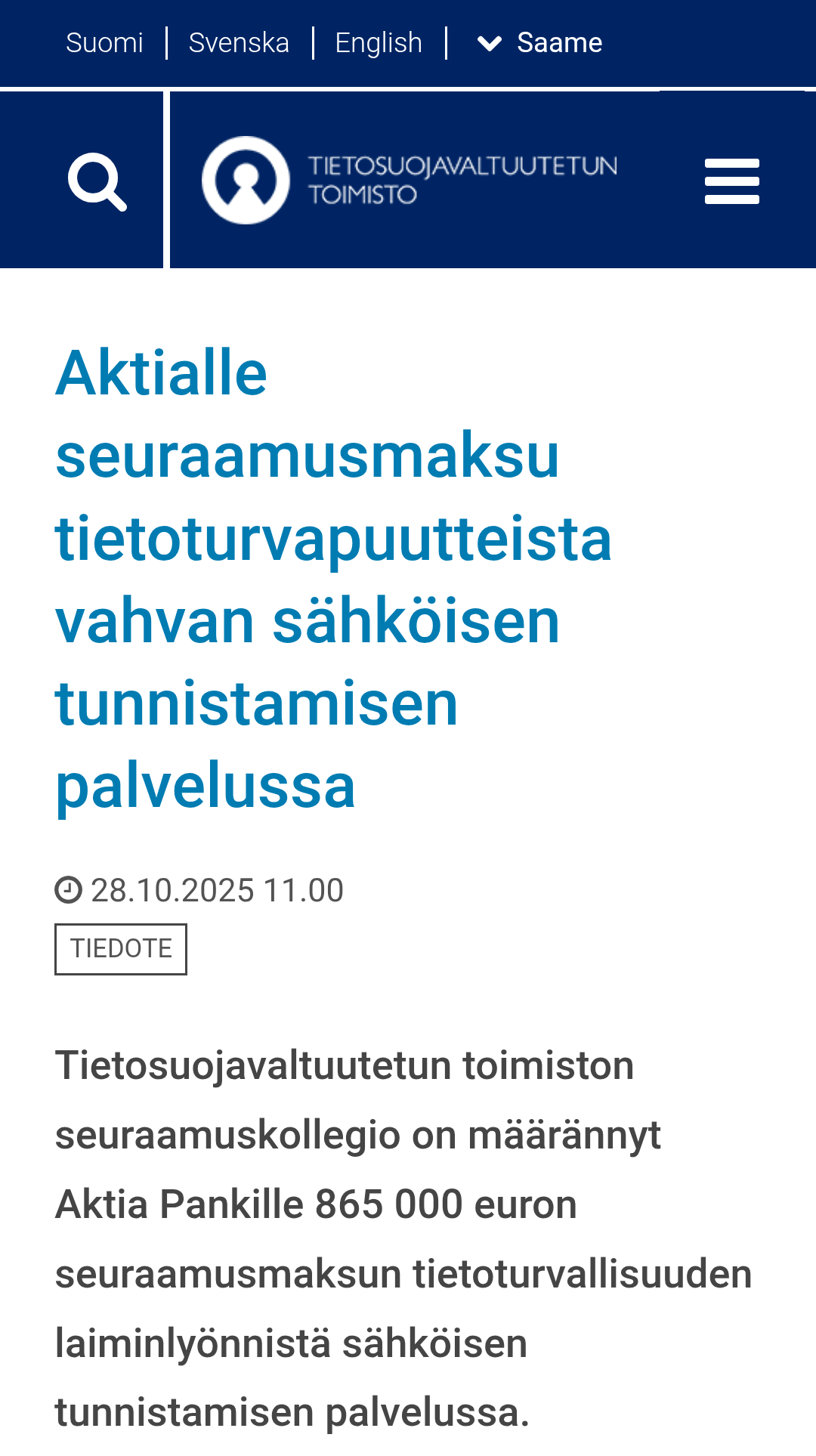 ”Aktian näkemyksen mukaan tietosuojaviranomaisen päätös sisältää virheellisiä tulkintoja Aktian tietoturvatestauksesta ennen tapahtunutta virhettä. Aktia pitää viranomaisen tulkintoja soveltuvasta sääntelystä sekä seuraamusmaksua ankarana suhteessa tapahtumaan, jossa on kyse yksittäistapauksesta ja jossa Aktia on reagointikyvyllään ja -nopeudellaan osoittanut organisaatiotasoista tietoturvaansa. Aktia tulee valittamaan päätöksestä hallinto-oikeuteen.”