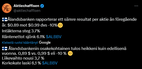 I couldn’t read today’s news in KL in more detail, where Aki Pyysing talks about his investment in an “elite bank”. Apparently, it’s Ålandsbanken, however. And it’s good to invest here/there! I’ve also had ÅB in my long-term portfolio for almost three years now, and I don’t intend to sell. Just on Monday, I conveniently bought a bit more.