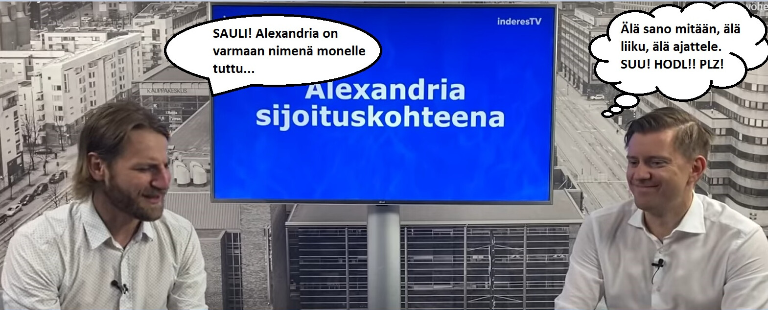 Alexandrian liiketoiminta on mielestäni epäeettistä ja en todellakaan toivo yhtiötä pyörittävien ihmisten rikastuvan entisestään Alexandrian kurssinousun avulla, mutta en silti lähtisi veikkaamaan kurssiromahdusta vain sen takia, etten itse pidä yhtiöstä.