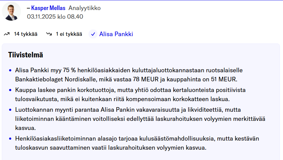 Yesterday I watched CEO Sampsa Laine’s “Inderes interview” from last August (Alisa Pankki H1’25: Alkuvuosi jäi pettymykseksi - Inderes). He spoke very consistently and realistically about past events and events aiming for the future. After the video, I read Alisa Bank’s press releases, events, and the Inderes forum to see what has happened in the real world since the interview. Indeed, those good positive things that Sampsa previously highlighted in the video have started to happen at Alisa Bank. And at what pace! A man of his word and deeds.