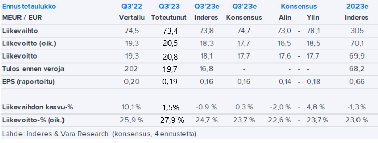 Alma Median Q3-tulos oli odotuksiamme parempi, mikä oli jälleen osoitus yhtiön kyvystä hallita kustannuksia ja näin sopeutua heikompaan toimintaympäristöön. Yhtiön oma tekeminen onkin erinomaisella tasolla, mikä on positiivista nyt kun toimintaympäristö on heikko ja lyhyen aikavälin talouskehitykseen liittyvät riskit sekä siten kysynnän kehitykseen liittyvä epävarmuus on korkea. Kuluvan vuoden ennusteemme nousivat, mutta lähivuosille emme ole tehneet juurikaan ennustemuutoksia.