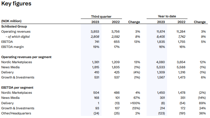 Firmaan on jäämässä siis Nordic Marketplaces jossa digitaaliasia palveluita asuntokauppaan, autoihin, rekryihin. Tutumpia nimiä mm Sanomalta hankittu Oikotie, Autovex, Tori, jne. Karkeasti 1-9/2023 noin 2/3 uudesta Schibstedistä.
