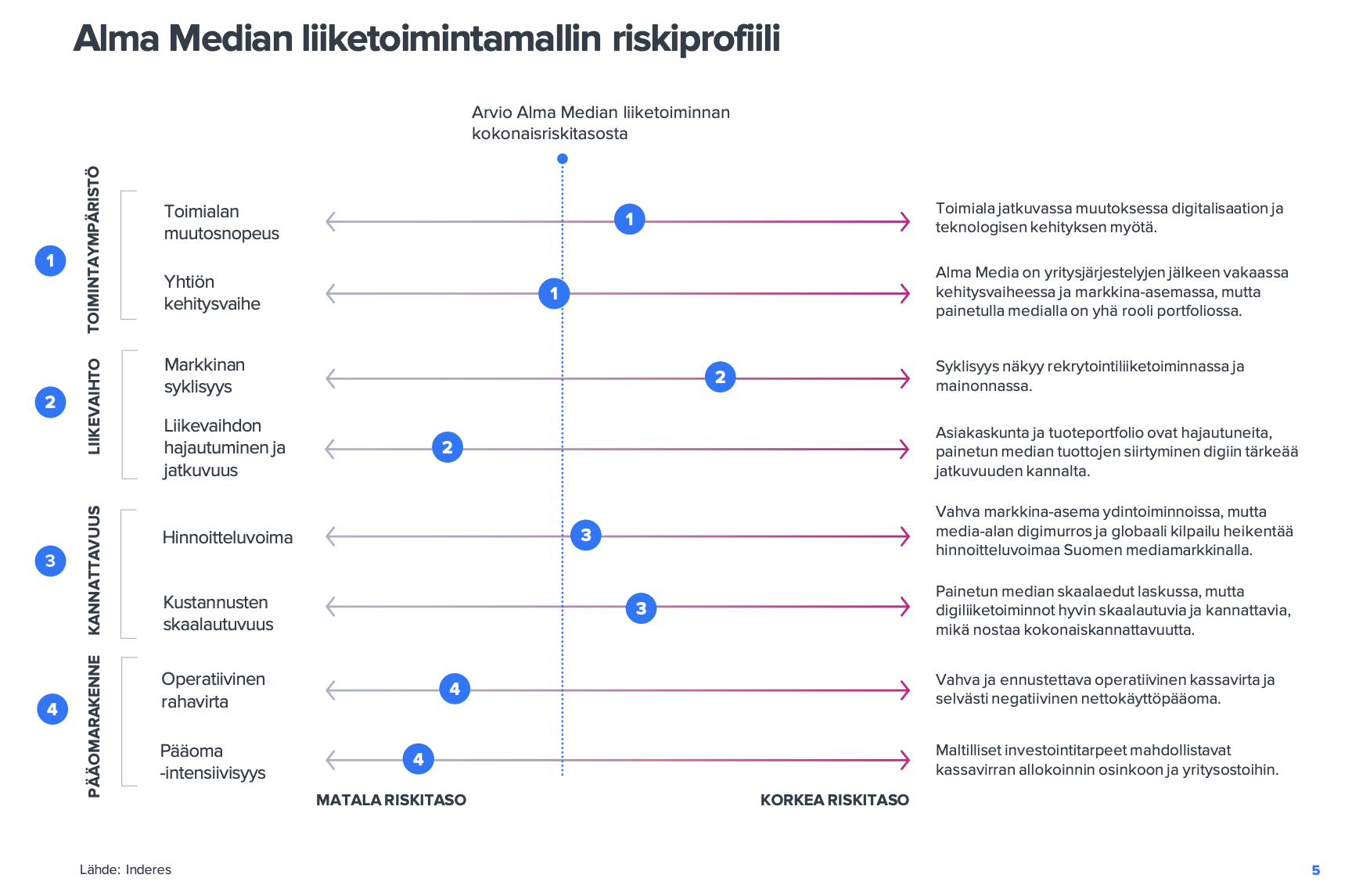Yhteenvetona todeten sanoisin, että medialiiketoiminnoista irrottautumisen tuloksena Alman kokonaisriskitaso voisi jonkin verran laskea, mutta ennen kaikkea Alma näyttäytyisi houkuttelevampana sijoituskohteena (kasvunäkymä, kannattavuus, arvonluontinäkymät).