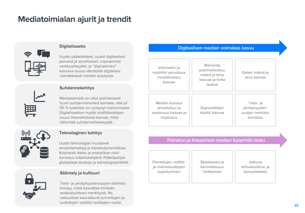 Mainonnassa kilpailu käydään globaaleja alustayhtiöitä, Facebookia, Googlea yms., vastaan ja sisällöissä perinteinen journalismi kilpailee päivä päivältä enemmän sisällöntuottajien kanssa. Nuoret hakevat tiedon nykyään TikTokista ja muualta.