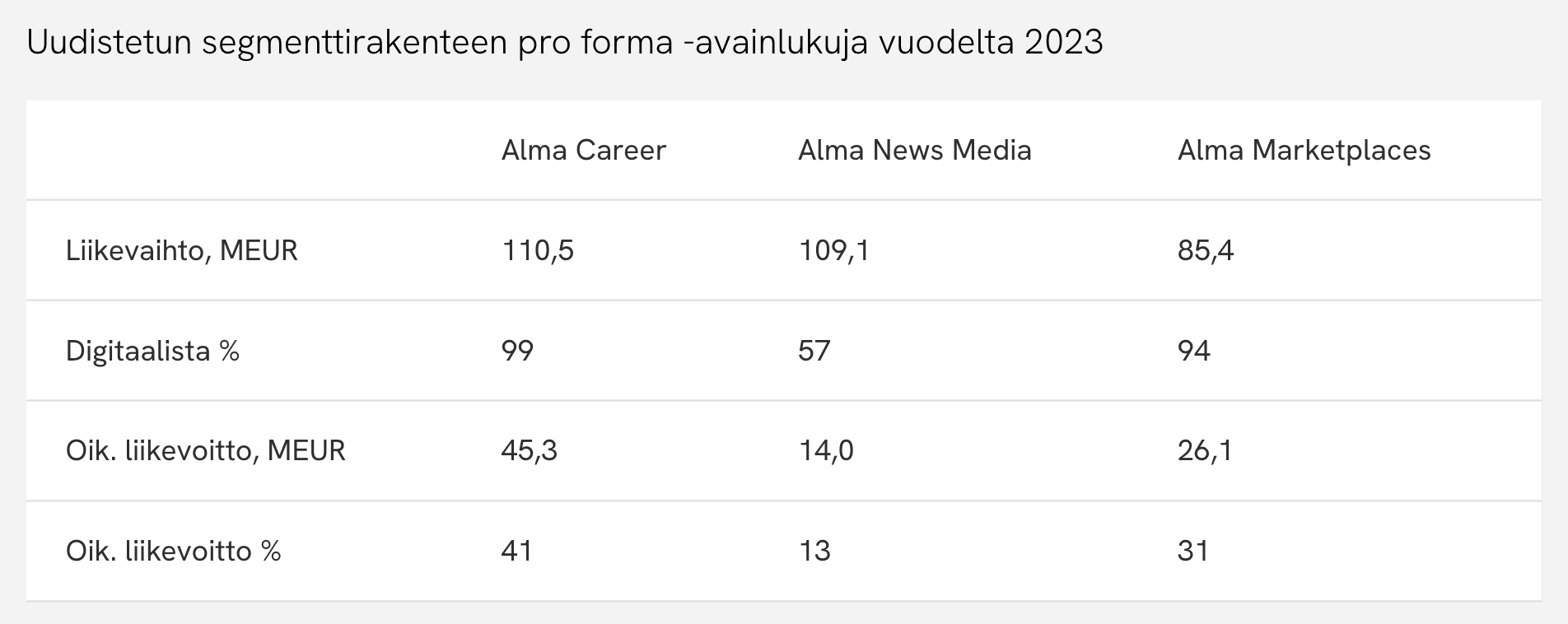 Alma Median uuden segmenttijaon mukaiset vertailuluvut julkaistu, PDF:ssä tarkemmin mutta ohessa uusien segmenttien mukaiset liikevaihdot ja liikevoitot. Lienee tuo “Kohdistamattomat” -12 MEUR segmenttien liikevaihdon puolella nuo konsernin yhteiset toiminnot.