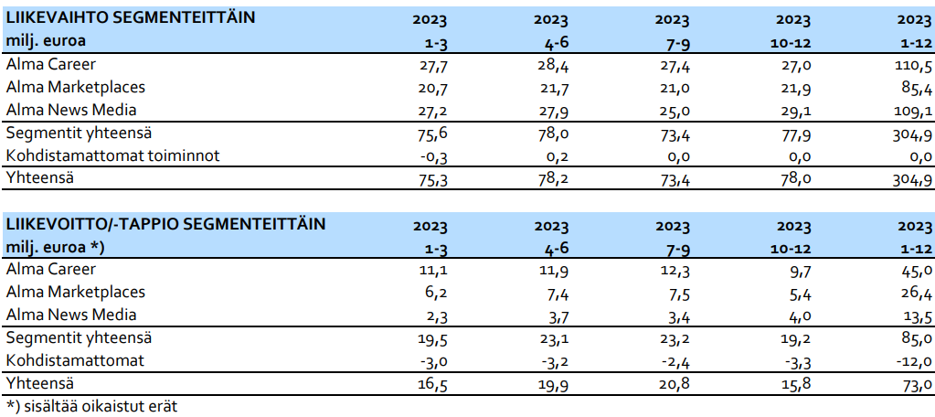 Alma Media tiedotti 16.2.2024 uudistetun segmenttirakenteen astuvan voimaan 1.3.2024. Alma Median liiketoimintasegmentit ovat Alma Career, Alma Marketplaces ja Alma News Media.