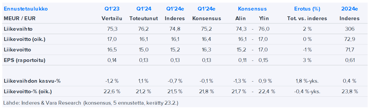 Alma Median Q1-raportin kokonaiskuva oli varsin neutraali, sillä Q1-luvut vastasivat hyvin odotuksiamme ja myös kuluvan vuoden ohjeistus toistettiin odotuksiemme mukaisesti. Tätä taustaa vasten emme ole tehneet kuluvan tai lähivuosien ennusteisiimme olennaisia muutoksia. Lyhyellä tähtäimellä yhtiö kärsii markkinan tahmeudesta, mutta yhtiön joustava kustannusrakenne antaa edellytykset puolustaa tulostasoa ennen kasvun piristymistä.
