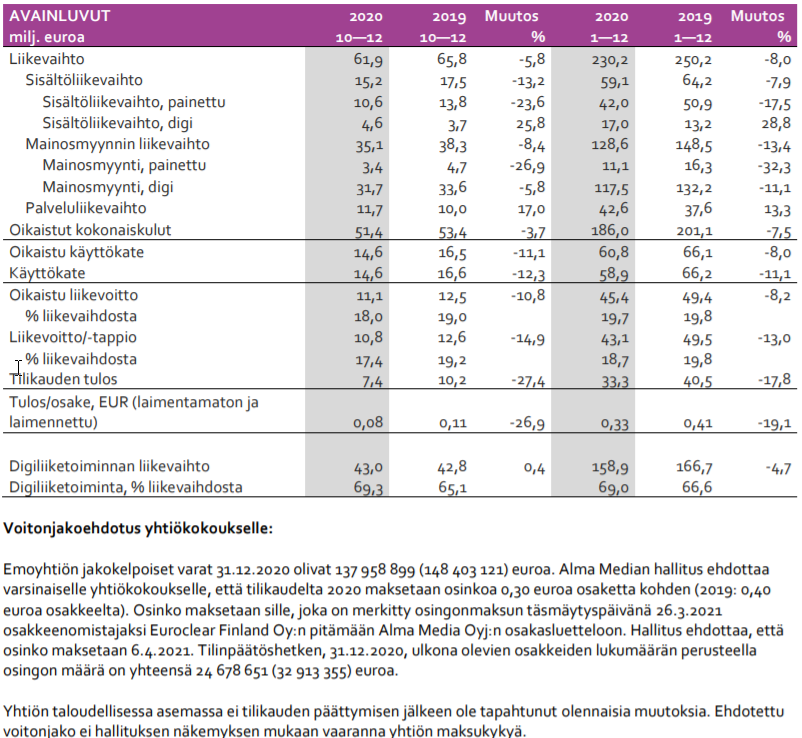 Alma Media arvioi jatkuvien toimintojen vuoden 2020 liikevaihdon laskevan selvästi ja oikaistun liikevoiton laskevan vuoden 2019 tasosta. Vuoden 2019 jatkuvien toimintojen liikevaihto oli 250,2 milj. euroa ja oikaistu liikevoitto 49,4 milj. euroa.