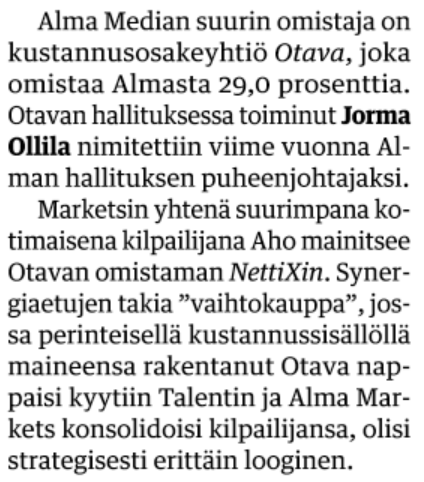 Itse pohdin vakavasti lisäsijoituksia yhtiöön alkuvuodesta. Alma Media ei paistattele isoissa valoissa, mutta mielestäni yhtiö on kehittämässä valtaisaa digitaalista brändisalkkua tällä hetkellä, joka on erittäin kannattavaa, jossain määrin skaalautuvaa ja se kasvattaa entisestään yhtiön mahdollisuuksia muuntautua myös tulevaisuudessa markkinoiden kehityksen mukana.