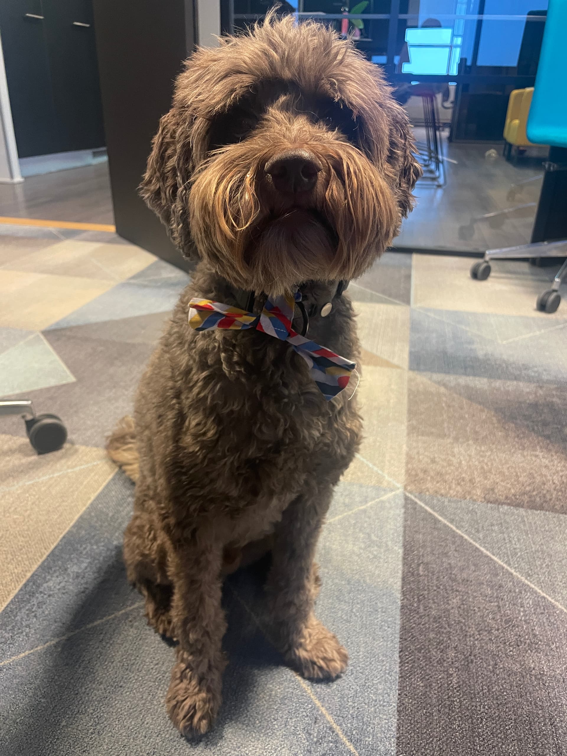 I attend meetings, sometimes awake and sometimes sleeping. Then people come to chat and scratch me, play tug-of-war, and sometimes I take them for a walk. Visitor groups are wonderful; they all love me and I often find new besties. I’m quite good at reading situations—who wants me in their lap and who not so much. You never know what a workday will hold!