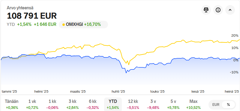 Harvia, Nordea, Evolution, Mandatum, TietoEvry, KH Group. Eli lähinnä vakaita osingonmaksajia ja muutama kasvuyhtiö. Jos 2 osaketta pitäisi valita pitkään holdiin, niin olivat ne seuraavat: