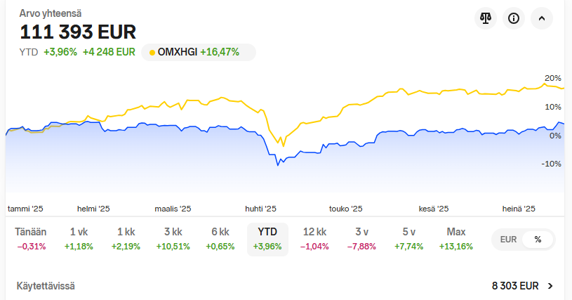 Minulla on taipumus hakea jännitystä sijoittamiseen, joskus liiankin isolla painolla. Saatan mennä yhtiöön hetkellisesti all in, jos uskon siihen vahvasti. Haen ylituottoa markkinaan verrattuna ja tämä saattaa joskus kostautua.