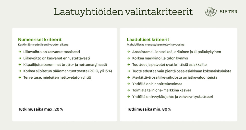 Haluan nähdä, tekeekö yhtiö tehokkaasti tulosta omistajien sijoittamalle pääomalle. Korkea ja tasainen ROE kertoo, että liiketoiminta on kunnossa ja että sitä osataan myös johtaa taitavasti.