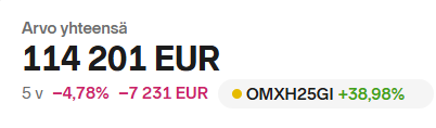 (3) Usko itseeni – viiden vuoden tuottoni on tällä hetkellä +74%, kun OMXH25GI on samaan aikaan tuottanut +45%. Sen verran on pääoma kiinni että tämä on euroissakin mittaava ero. En toki tiedä pystynkö jatkossakin tähän, ja siinä vaiheessa kun tilanne muuttuu pidemmäksikin ajaksi olen kyllä sen verran nöyrä että olen valmis harkitsemaan muutosta; toki huomoiden myös kohtaa (1).