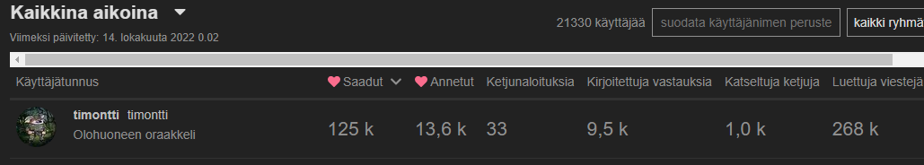 Olohuoneen orakkeli ja Foorumin tykätyin mies, tässä vähän statistiikkaa: