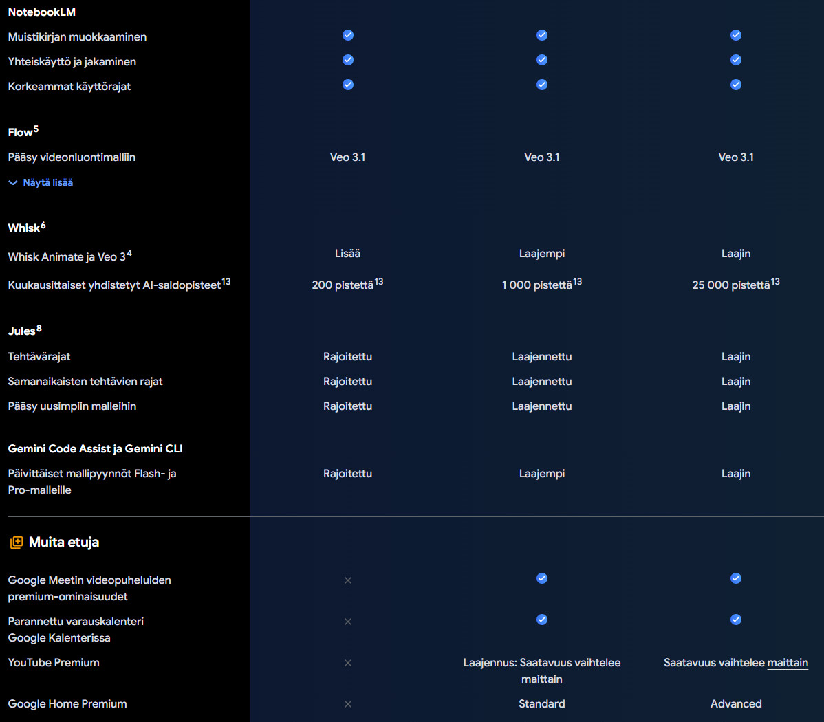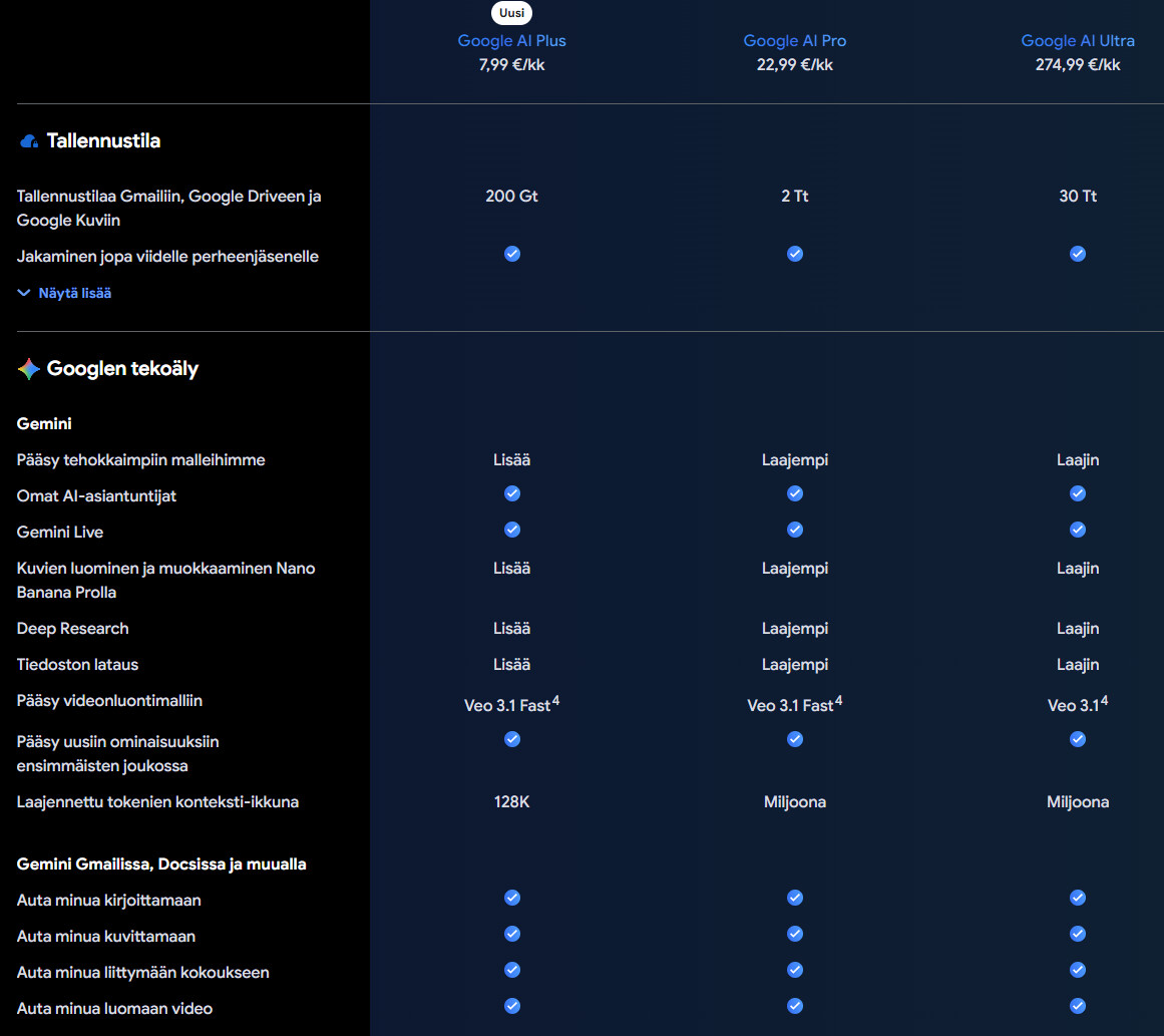 Käyttäjiä tuntuu riittävän ja kun on puhuttu näistä pilvitallennustilojen kuukausitilauksista, niin Googlen osalta aika herkästi saattaa tarttua tällaiseen pakettiin, jossa tulee AI-toiminnallisuuksia ja tallennustilaa samalla kertaa. Basic paketti Google AI plus 7,99€/kk. Se on käytännössä yksi erikoiskahvi kuukaudessa.