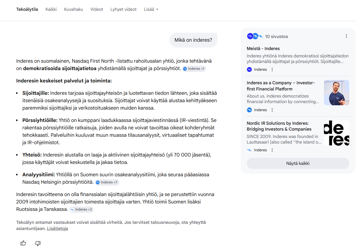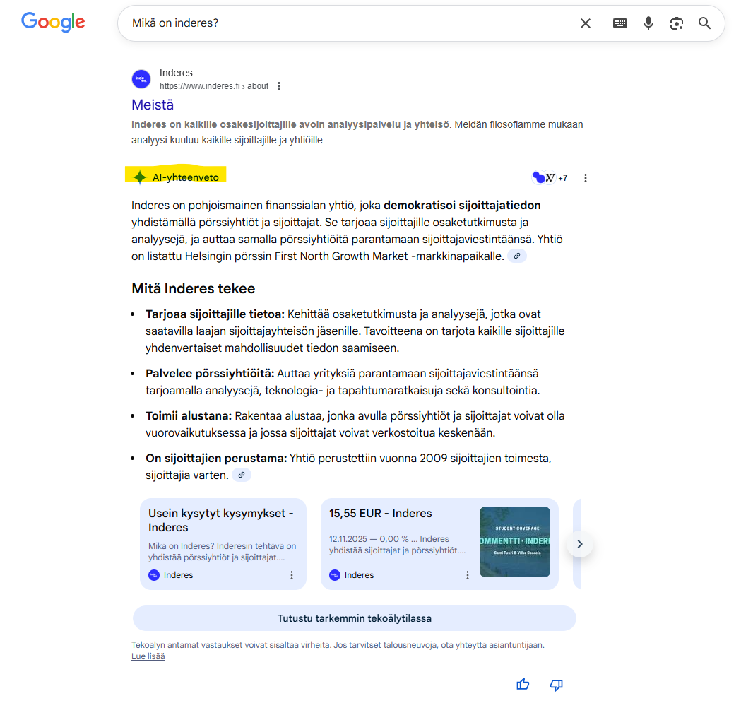 Ja vaikka hakukoneen käytön laskua on povattu jo kohta kymmenen vuotta, niin sitäkin kehitetään jatkuvasti ja aiemmin haku antoi AI-yhteenvedon