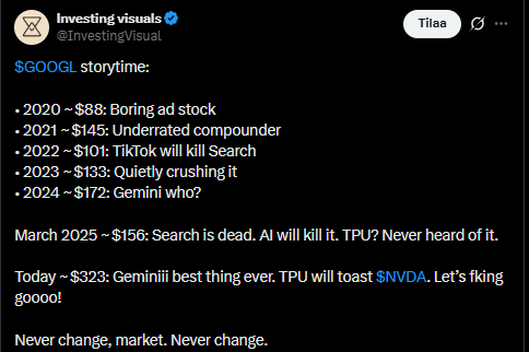 Mag7 on jäänyt monien ylituottoa etsivän osakepoimijan tarkkailusta ihan sillä perusteella että niissä on isot kertoimet ja taitavat analyytikot seuraavat niitä. Niistä löytää kuitenkin tarpeeksi usein ihan hulluja narratiiveja. Alphabet ei ollut ketterin uusien teknologioiden käyttöönotossa ja haun tueksi tuodut Gemini-viritykset olivat aluksi heikkoja - mutta kuka ihme kuvitteli että maailman käytettyimpään hakukoneeseen voi julkaista kaikille käytössä olevan GenAI-avustajan, joka edustaisi maailman kärkeä? Mistä ihmeestä tarvittava laskentateho revittäisiin?
