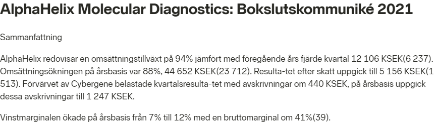 Bokslutskommuniké 2021 - AlphaHelix Molecular Diagnostics (cision.com)