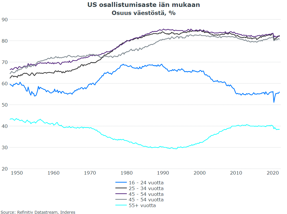 Joo totta että taantumaa on aina edeltänyt todella vahva kehitys työmarkkinalla. Nyt talouden tilannekuvan hahmottamista entisestään vaikeuttavat koronapandemian aiheuttamat vääristymät työmarkkinalla. Yksi olennaisista kysymyksistä on se, jääkö työhön osallistuminen pysyvästi alemmalle tasolle vanhemmissa ikäluokissa. Mikäli näin on, työmarkkinalla voidaan nähdä niukkuutta pidempään.