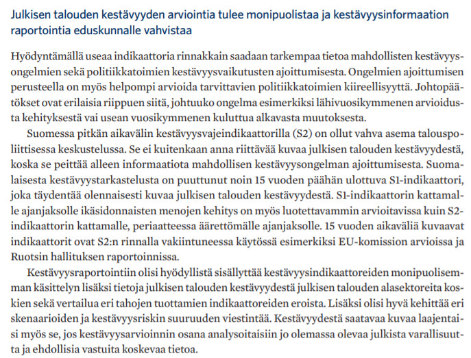 lukaisin äsken Hurrin tekstin, ja kyllähän siellä totuuden siemeniäkin löytyi. Kestävyysvajemittarin ongelmana on vähän sama kuin makroindikaattoreilla yleensä: yhteen lukuun yritetään puristaa mahdollisimman paljon tietoa koko taloudesta, ja aina jotain jää puuttumaan. Kestävyysvajemittari tosin kiinnostaa erityisesti, sillä sen pohjalta tehdään suuria poliittisia päätöksiä.