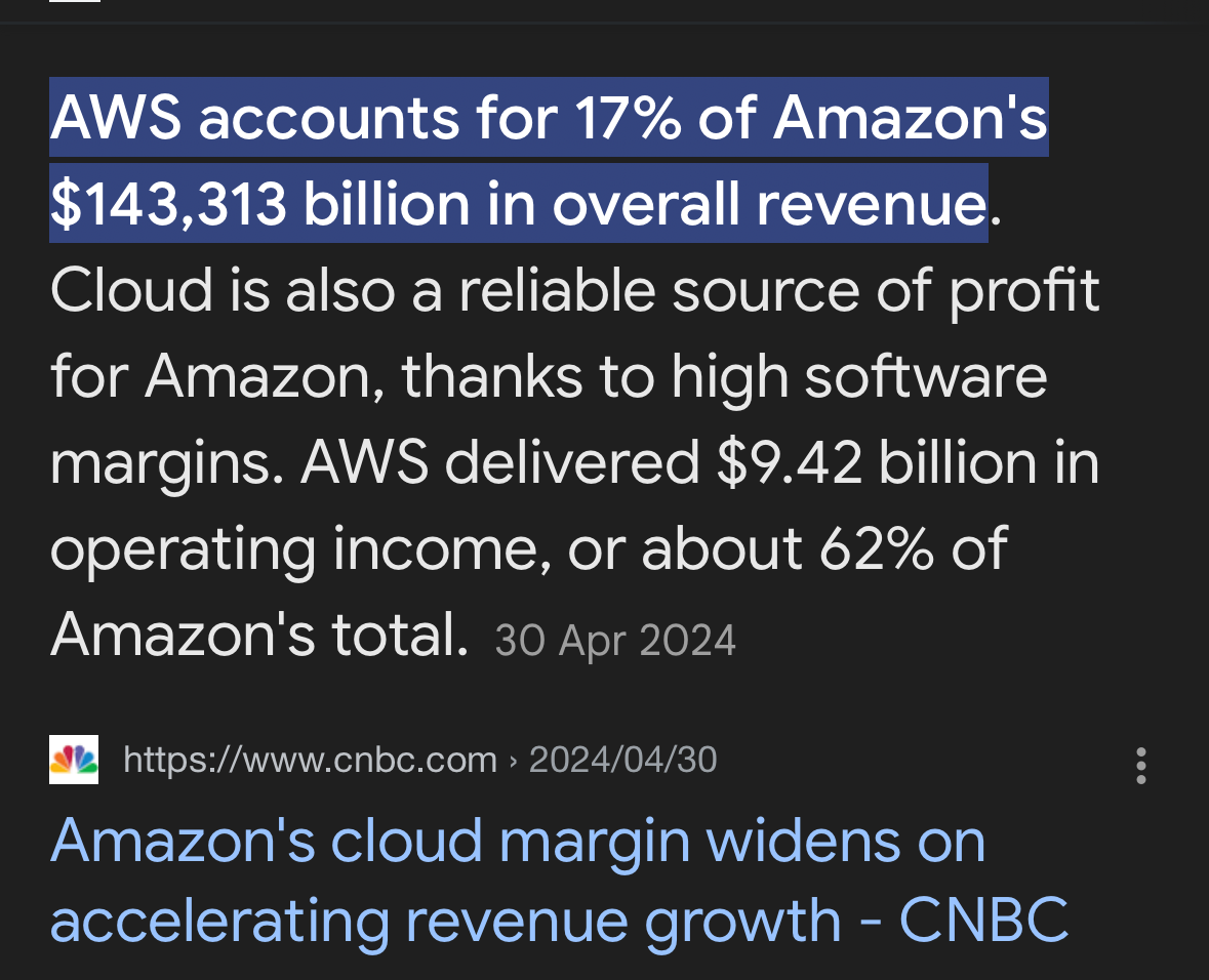 The article is nice, but it overlooks the fact that Amazon is more than just an online store. Namely, AWS, or Amazonâs cloud service platform, is a very important part of the business. This search result I dug up from Google illustrates it: