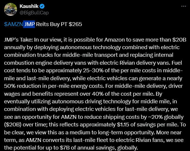 According to the view cited in the tweet, Amazon could save more than $20 billion a year by using autonomous electric vehicles and electric delivery vans. This would significantly reduce fuel costs and transportation costs in general. Savings are expected to grow over time as more and more vehicles are replaced with electric and autonomous ones.