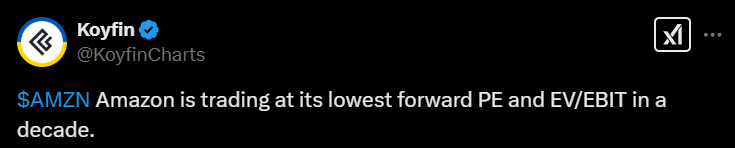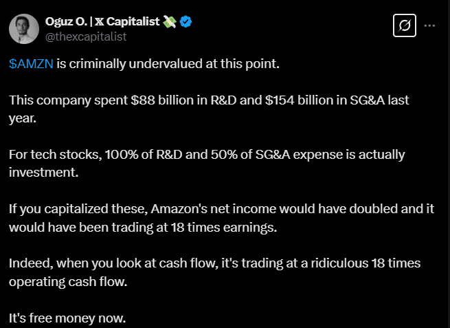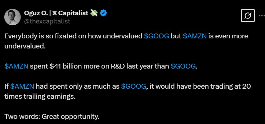 Here is a tweet from an Amazon bull. On X, bears are generally few for any company, especially among those tweeting in English, so these should be approached with caution for that reason (among others). ![]()